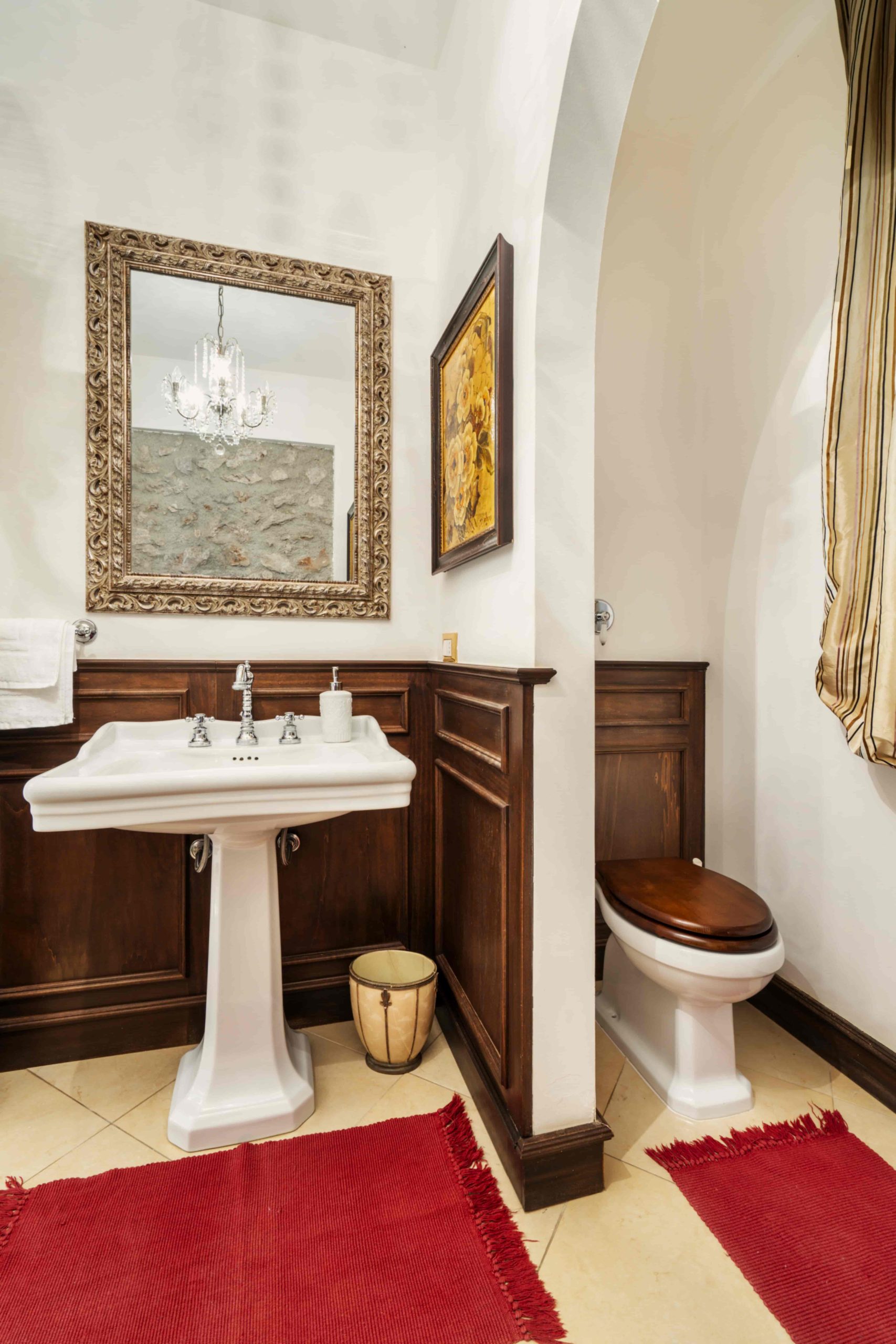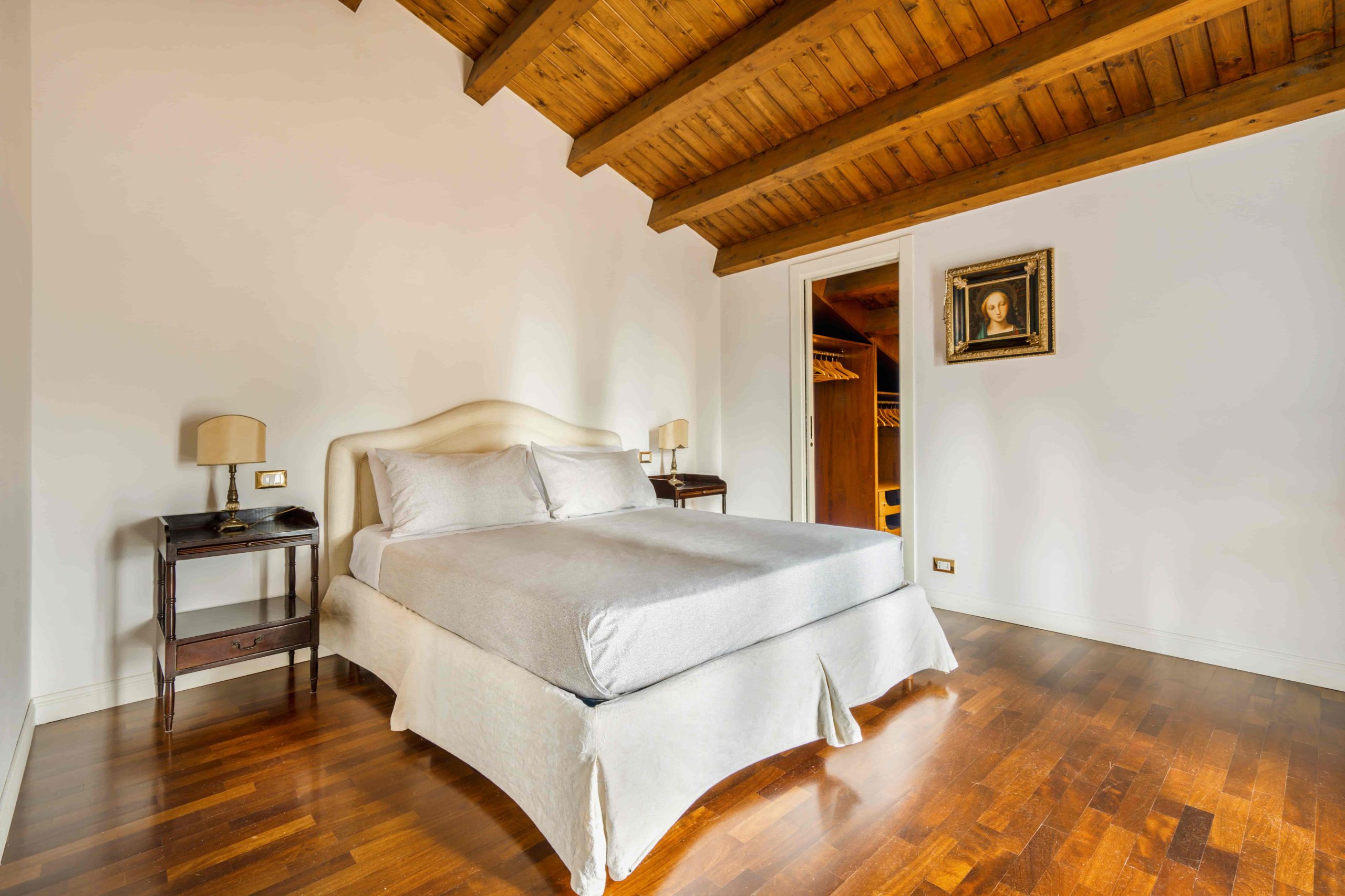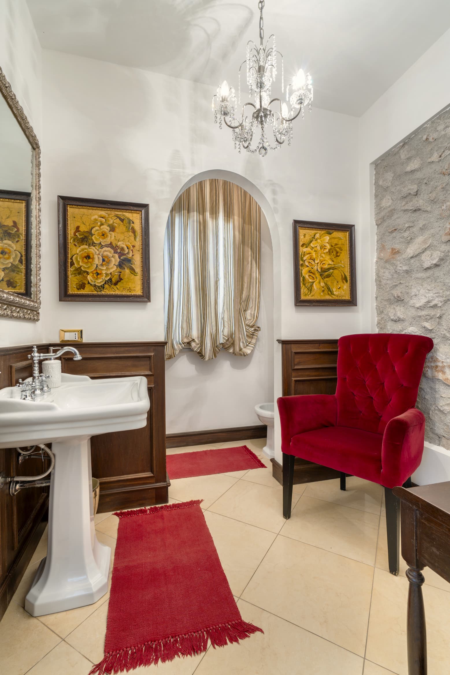 The interiors, bright and meticulously designed, blend historic elegance with modern comfort, featuring restored antique furniture and high-quality materials.